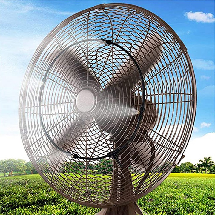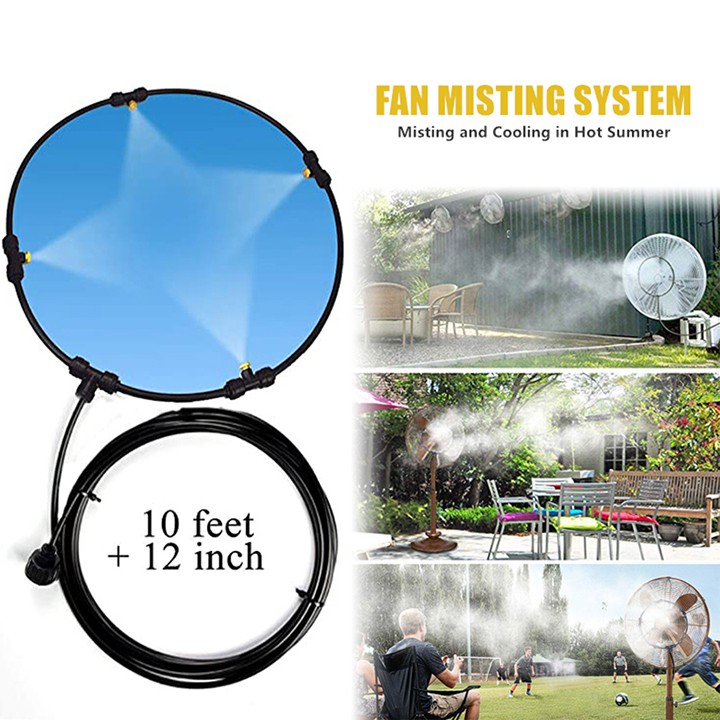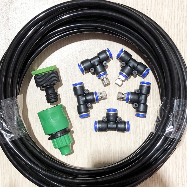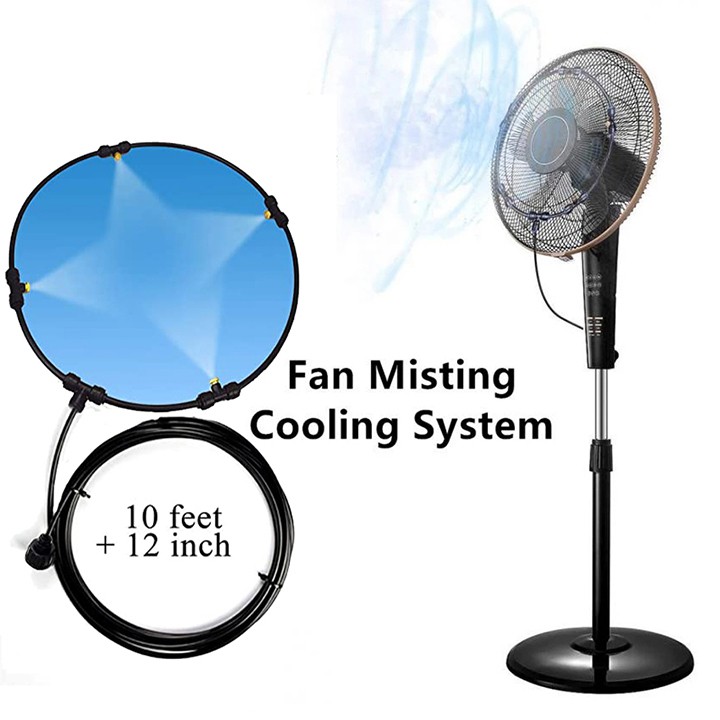 - Bộ sản phẩm trọn bộ đầy đủ, khách hàng tự cắt ống dây cắm nối tiếp đầu phun sương kết thành vòng tròn bán kính tùy thích để gắn vào quạt.