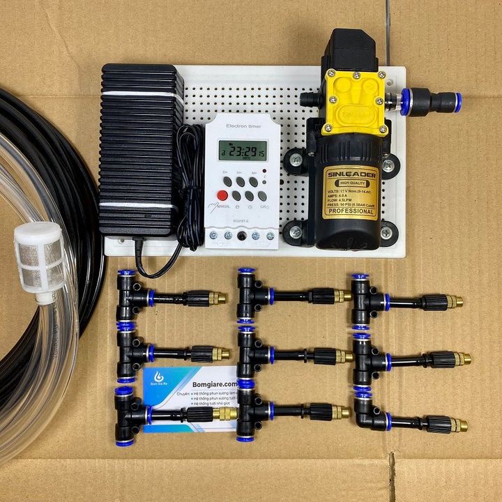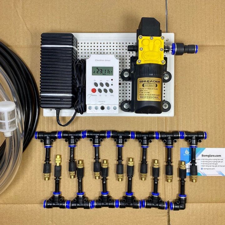 BỘ PHUN SƯƠNG 20 BÉC PHUN SƯƠNG BĂNG ĐỒNG TỰ ĐỘNG = hẹn giờ time bao gồm (20m day, bơm đôi, nguồn tổ ong, 20 béc phun sương, timer hẹn giờ)