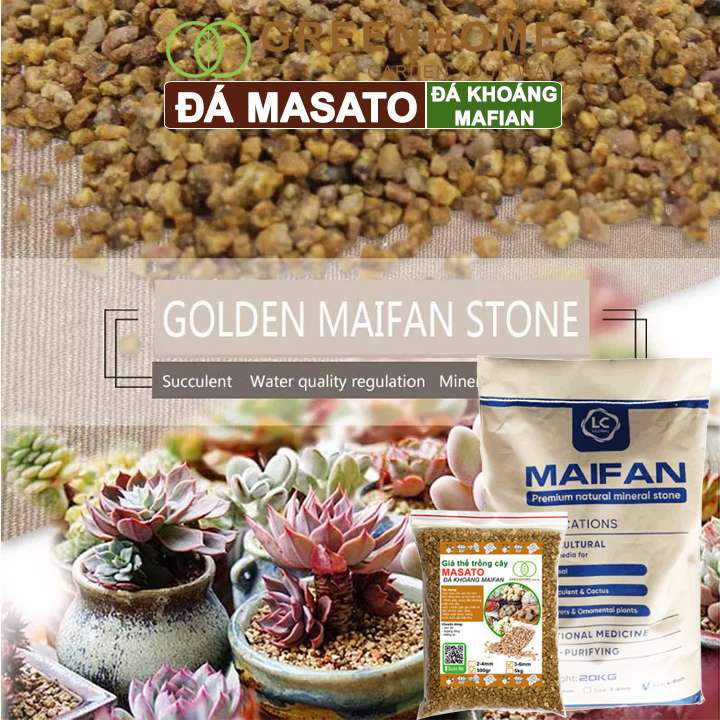 - Masato rãi mặt chậu đẹp mắt: Masato có tính cứng và nặng, nên được cộng đồng sen đá yêu thích dùng rải mặt chậu do khó bị thổi bay. Bản thân đá Masato có màu vàng, khi tưới nước lên càng óng ánh rực rỡ, chậu cây lại càng toả sáng dưới nắng.