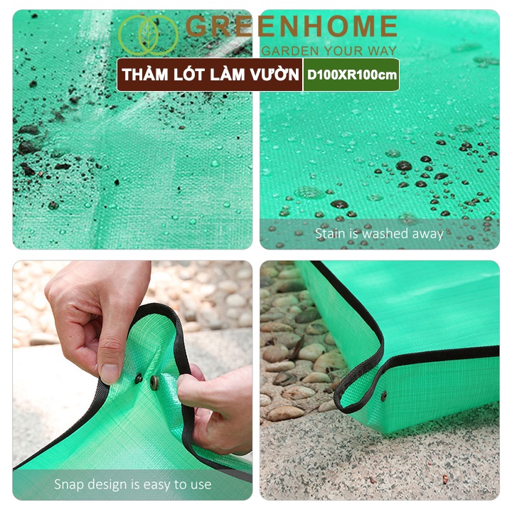 - Thảm lót làm vườn với bốn góc có nút để ngăn nước và đất rò rỉ ra ngoài. Mỗi bốn góc có hai khóa đồng. Khi sử dụng, nước và đất không dễ tràn ra ngoài và tránh làm bẩn sàn nhà, bắt bụi bẩn tuyệt vời